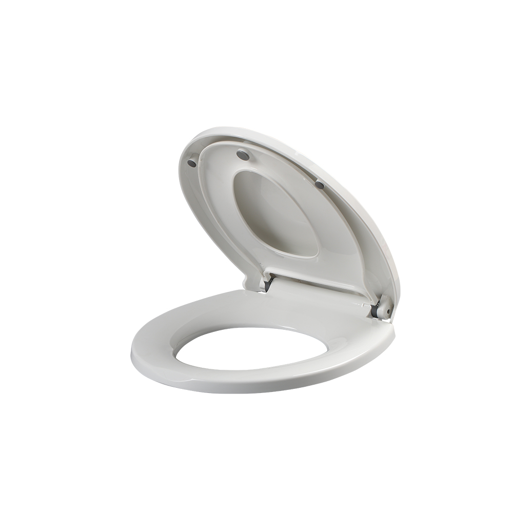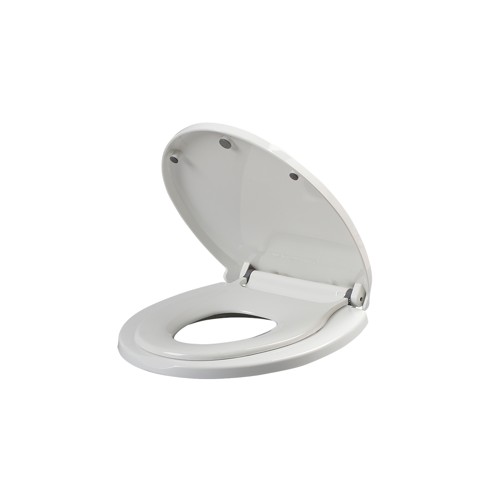 Asiento aro redondo con adaptador infantil incorporado y sistema de cierre suave. Fabricado en polipropileno, con bisagras metálicas ajustables y sistema click off desmontable.