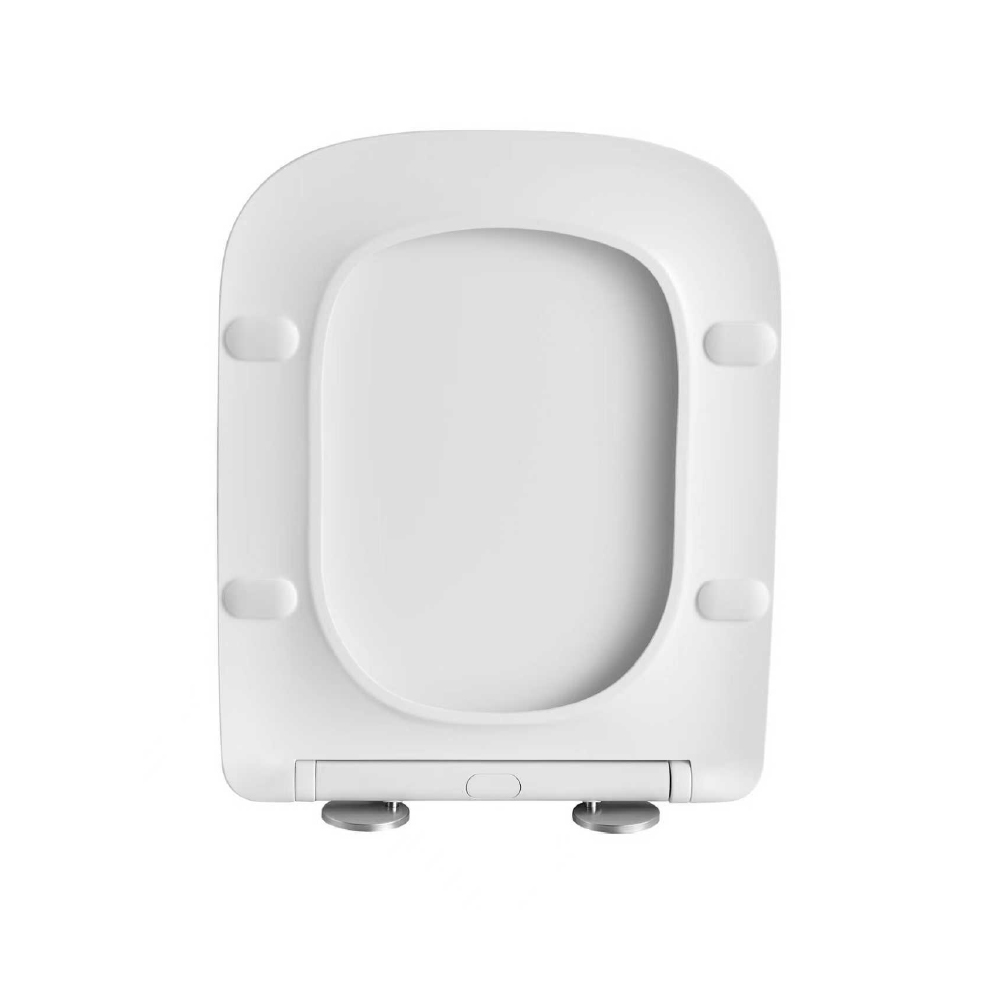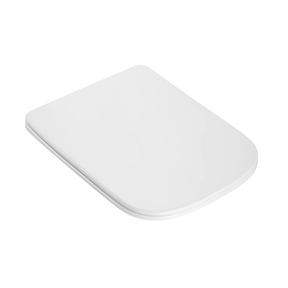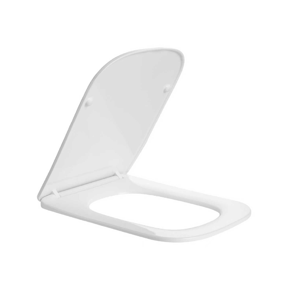 Asiento Square Slim para inodoro One Piece Square, fabricado en urea con bisagras de acero inoxidable ajustables. Incluye sistema de instalación superior, Cierre Suave y Click-Off desmontable para mayor comodidad y durabilidad.