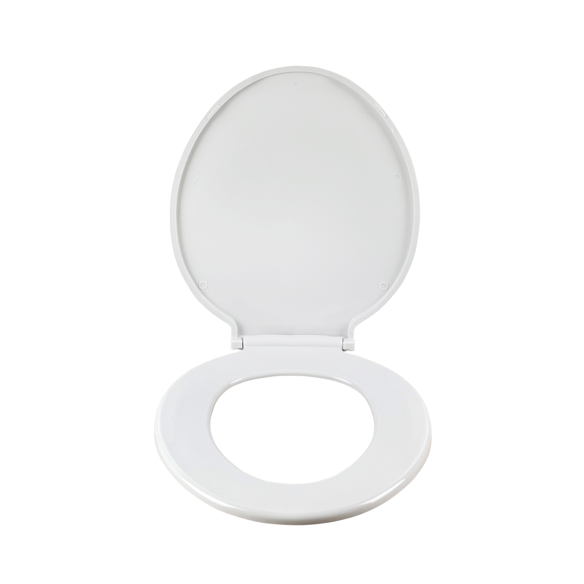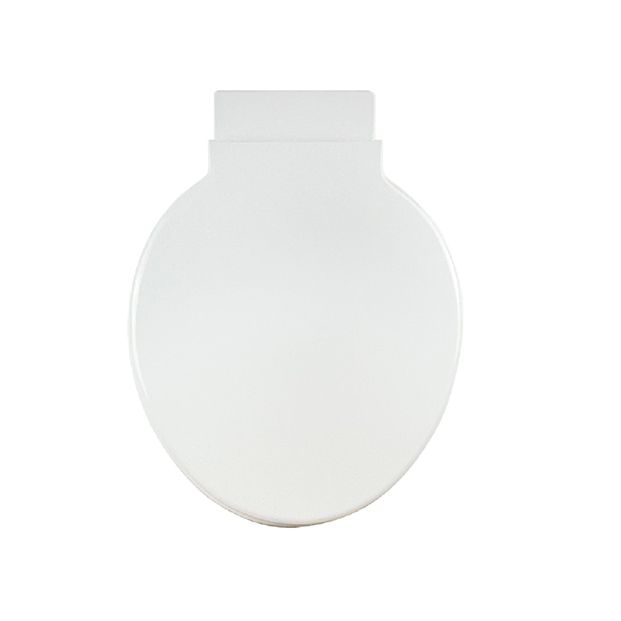 Asiento de formato redondo fabricado en polipropileno con bisagras plásticas ajustables de 3 posiciones. Cierre normal y sistema de instalación con tuerca inferior.