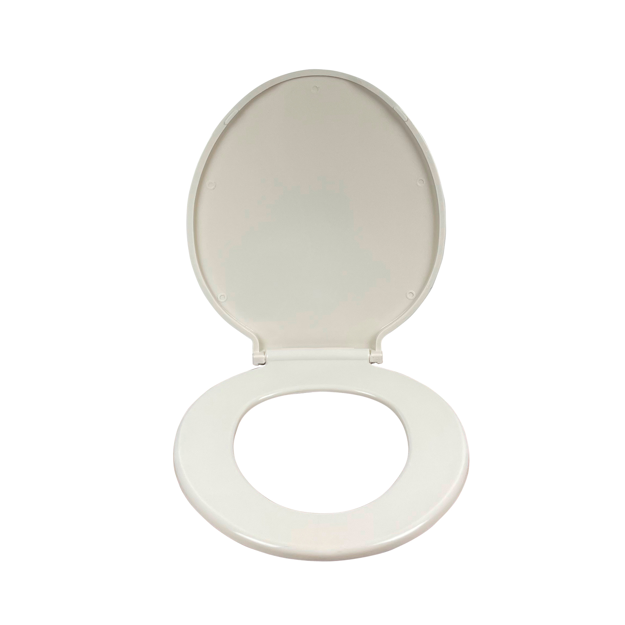 Asiento de aro redondo color Bone fabricado en polipropileno resistente, con bisagra plástica ajustable alargada. De fácil limpieza, larga durabilidad y peso de 1,2 kg