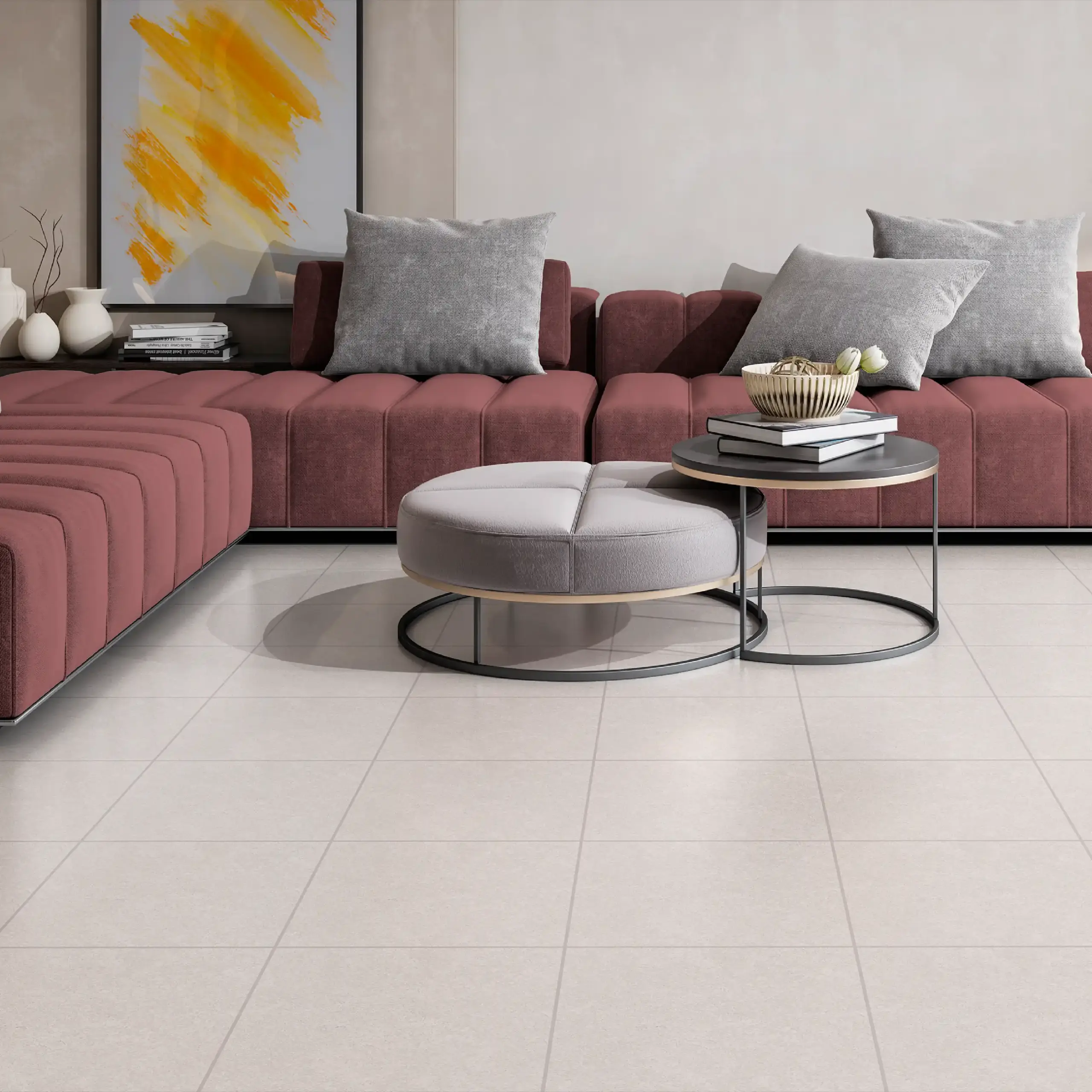 La cerámica con acabado mate acetinado combina textura suave, diseño natural y alta durabilidad, ofreciendo una estética moderna y acogedora para cualquier ambiente interior. Su variación de tono V4 crea un efecto visual dinámico, con matices únicos en cada pieza que aportan personalidad y calidez a los espacios.