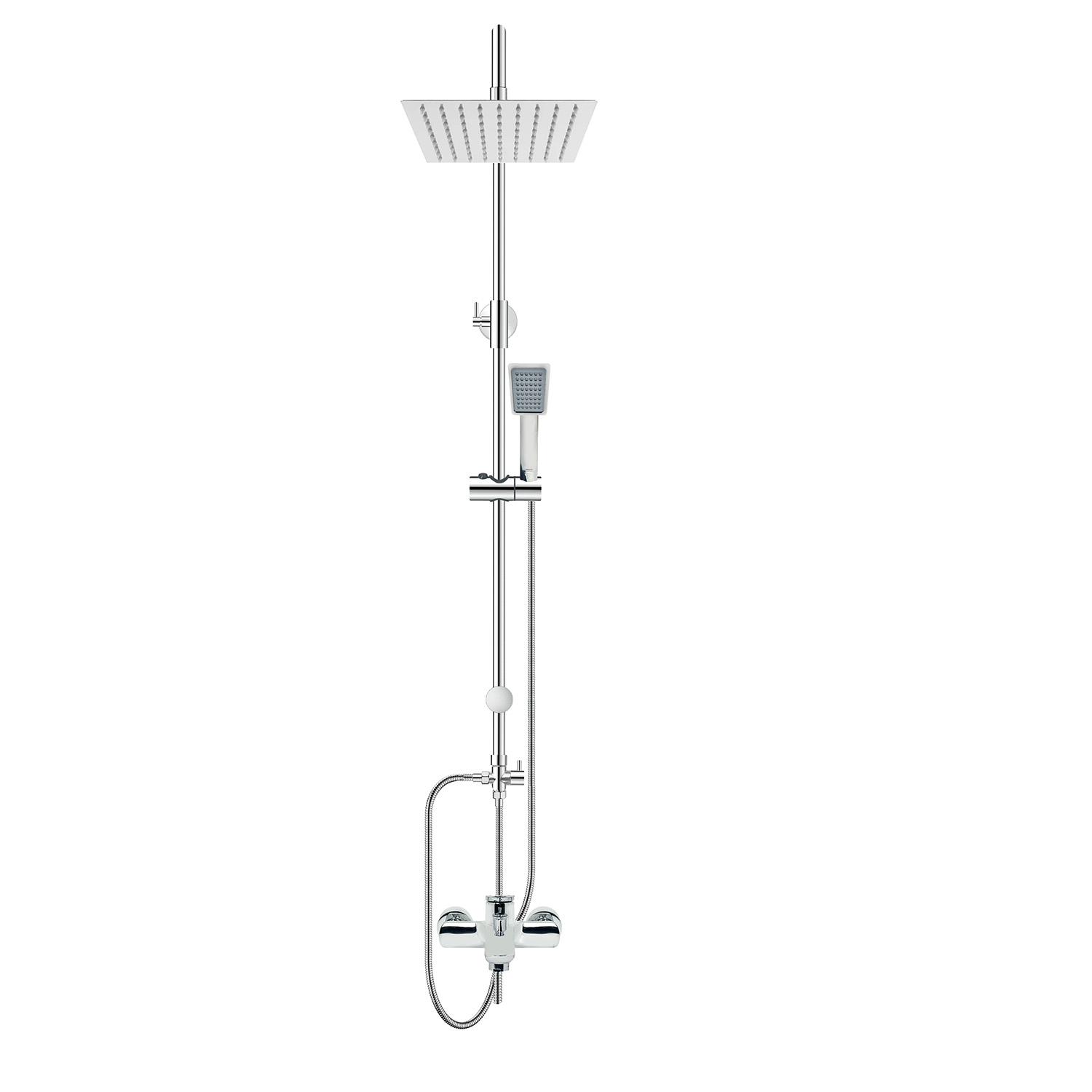 Set de columna de ducha ajustable con grifería para tina y ducha. Fabricado en acero inoxidable y latón cromado, con acabado brillante y componentes de alta durabilidad. Incluye mango de ducha, flexible y plato slim.