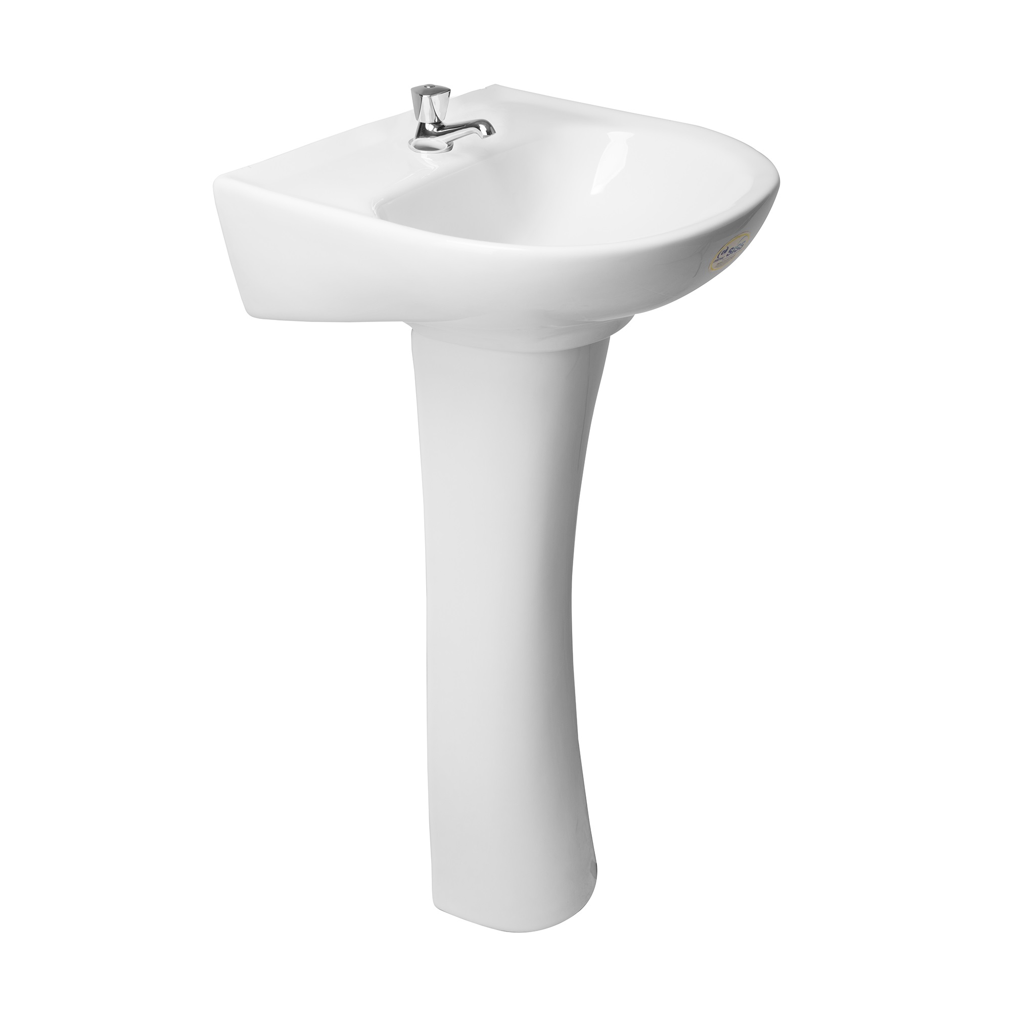 Lavamanos con perforación para grifería monomando o monoblock, equipado con rebalse para mayor seguridad. Capacidad de 3,7 L, con pedestal incluido. Resistente, funcional y perfecto para baños modernos.