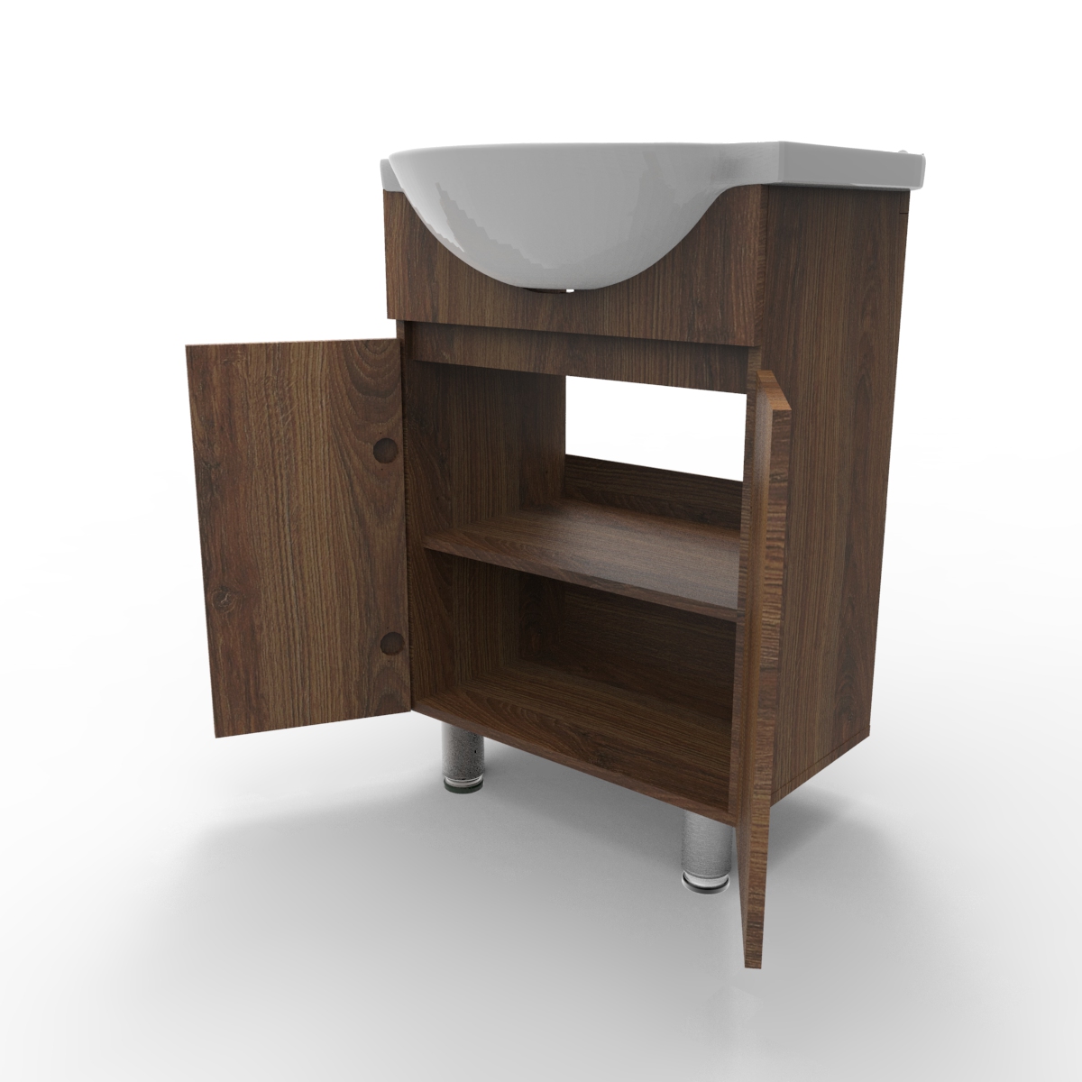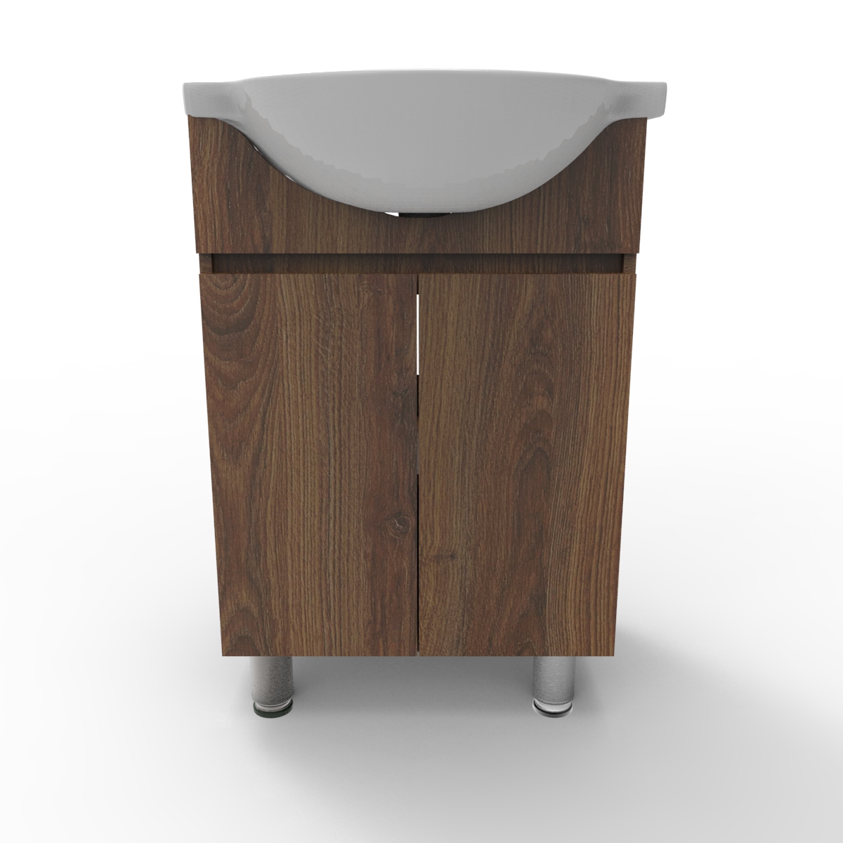 Mueble vanitorio a piso de melamina 15 mm con dos puertas, repisa interior y bisagras cierre suave. Incluye cubierta de cerámica sanitaria con rebalse, apta para grifería monomando o monoblock. Diseño resistente, moderno y funcional.