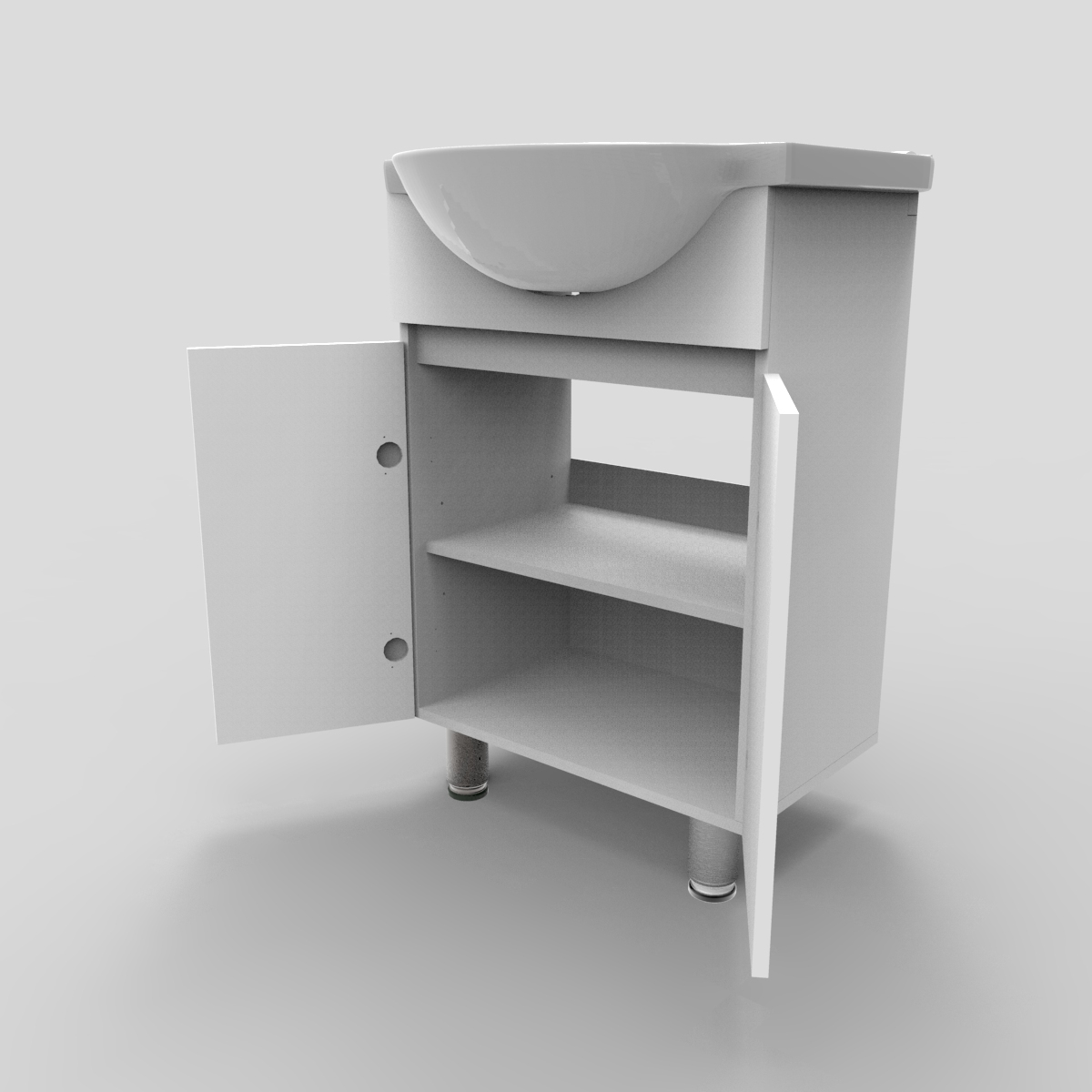 Dale a tu baño un estilo moderno y funcional con este mueble vanitorio a piso, diseñado para ofrecer resistencia, capacidad de almacenamiento y una instalación estable. Fabricado en melamina de 15 mm, cuenta con dos patas frontales, dos puertas y repisa interior, permitiendo organizar y guardar artículos de higiene con facilidad. Sus bisagras de 35 mm con cierre suave aseguran un uso cómodo y silencioso.