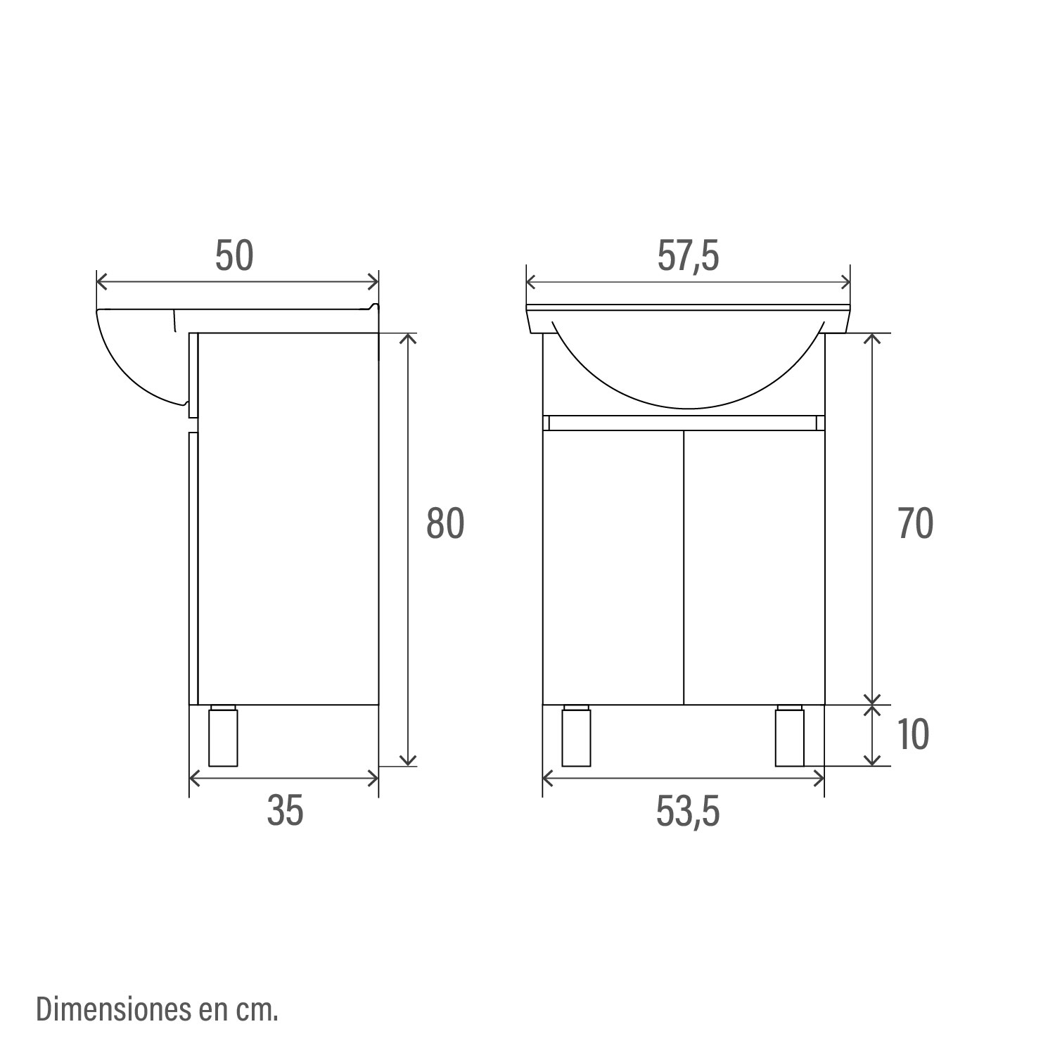 Dale a tu baño un estilo moderno y funcional con este mueble vanitorio a piso, diseñado para ofrecer resistencia, capacidad de almacenamiento y una instalación estable. Fabricado en melamina de 15 mm, cuenta con dos patas frontales, dos puertas y repisa interior, permitiendo organizar y guardar artículos de higiene con facilidad. Sus bisagras de 35 mm con cierre suave aseguran un uso cómodo y silencioso.