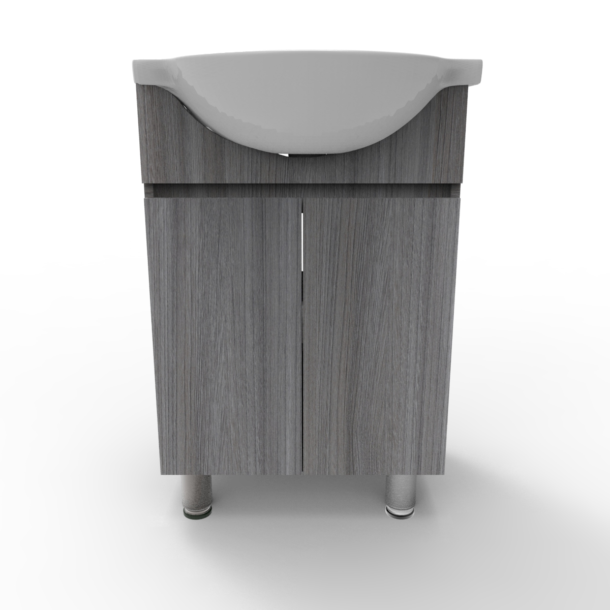 Mueble vanitorio a piso de melamina 15 mm con dos puertas, repisa interior y bisagras cierre suave. Incluye cubierta de cerámica sanitaria con rebalse, apta para grifería monomando o monoblock. Diseño resistente, moderno y funcional.