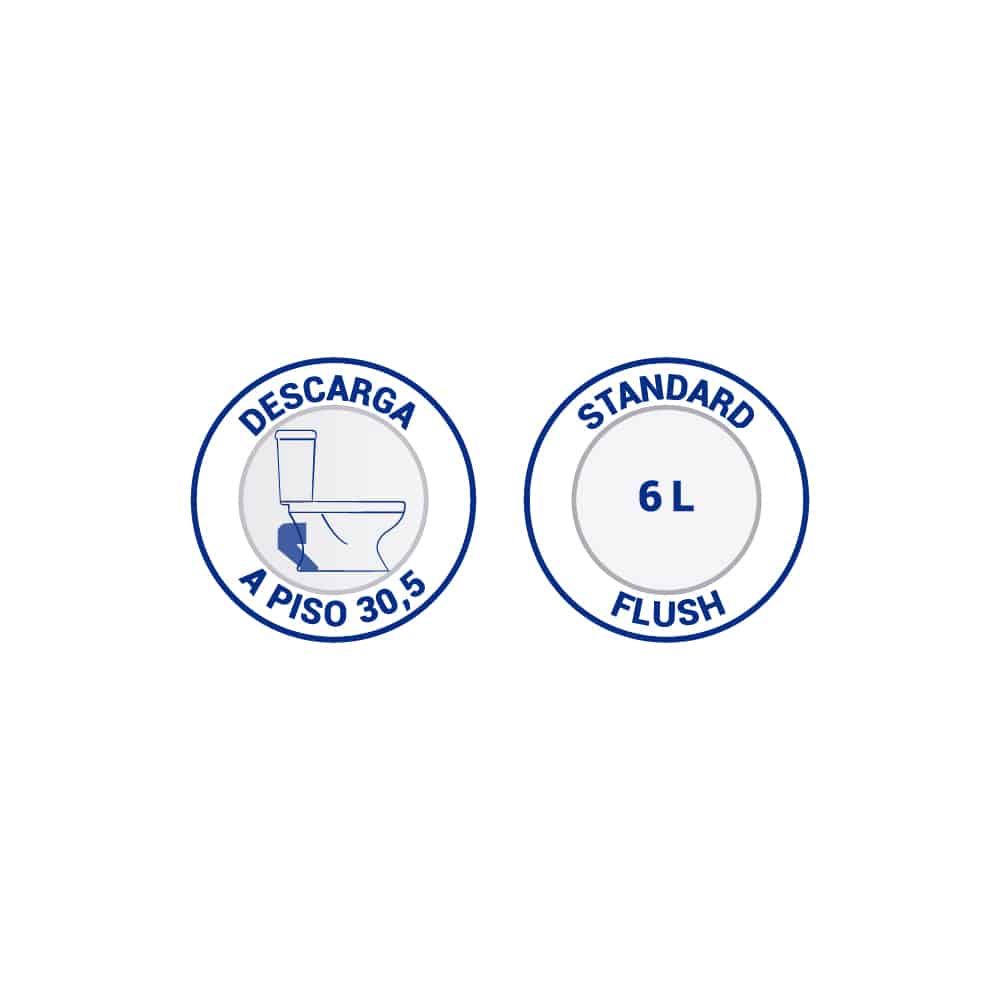 El inodoro cuenta con un sistema de descarga de bajo consumo, con 6 L para desechos sólidos y 4,1 L para líquidos, accionado mediante una manilla plástica blanca. Su funcionamiento de acción directa con efecto de sifón, junto con la trampa reversa y el anillo abierto integrado, aseguran una descarga confiable y una limpieza uniforme. Está disponible en descarga al piso a 30,5 cm y cuenta con aro redondo en color blanco.